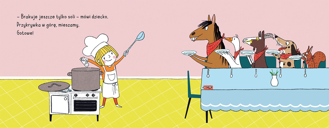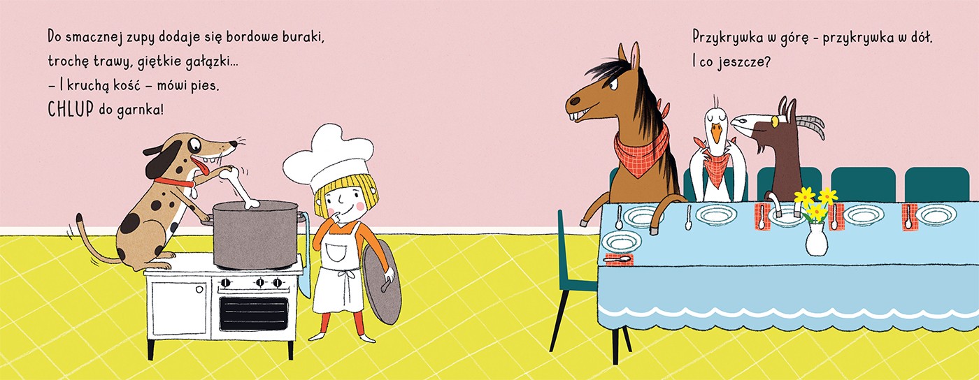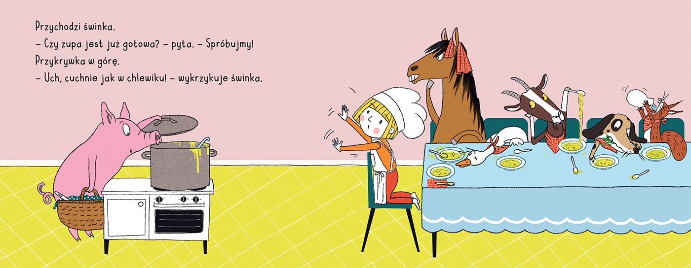 Jest południe – czas na zupę. Wszyscy wiedzą, co się do niej dodaje: koń przynosi bordowe buraki, koza giętkie gałązki, pies kruchą kość… Ale czy zupa będzie smaczna?